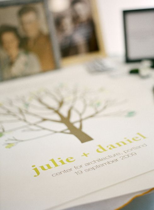 Says Julie, "I’m a big fan of design blogs and used some of them for inspiration along with indie wedding blogs. I’m drawn to the style of the 1960’s and knew that I wanted to incorporate those elements with a modern/natural edge. An idea we borrowed from a blog was the Wedding Tree. Our graphic designer friend Matt created an image of a barren tree. We asked all of our guests to use various shades of green stamp ink to stamp their thumbprints on the tree as leaves. This, along with our typewriter, was used as our guest book."